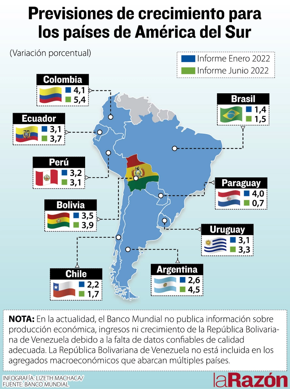 El Banco Mundial (BM) subió la previsión de crecimiento del Producto Interno Bruto (PIB) de Bolivia de 3,5% a 3,9% para la presente gestión. La revisión al alza de esta proyección lo sitúa entre los tres países de mayor expansión de su economía en América del Sur.