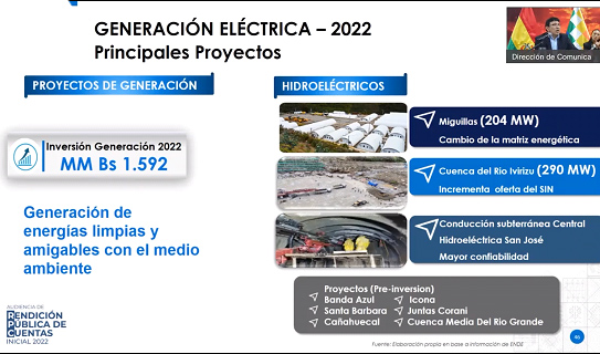 En su Rendición de Cuentas el Ministerio de Hidrocarburos y Energía, a través de su titular Franklin Molina, indicó que el Gobierno tiene proyectos para aumentar la capacidad instalada a más de 500 MW, con una inversión de 1.592 millones de bolivianos, entre los principales están los hidroeléctricos de Miguillas en La Paz e Ivirizu en Cochabamba.