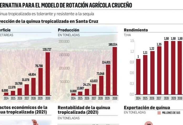 Respecto a los impactos esperados de la quinua tropicalizada en Bolivia, el decano de la Facultad de Ciencias Agrícolas de la Uagrm, José Luis Llanos, proyectó un cobertura de siembra de 8.000 a 120.727 hectáreas del 2024 al 2030. En ese periodo, se perfila una producción de 180.514 toneladas que, a un precio promedio de exportación de $us 2.162, estimándose un ingreso por valor de casi $us 400 millones para la economía nacional.