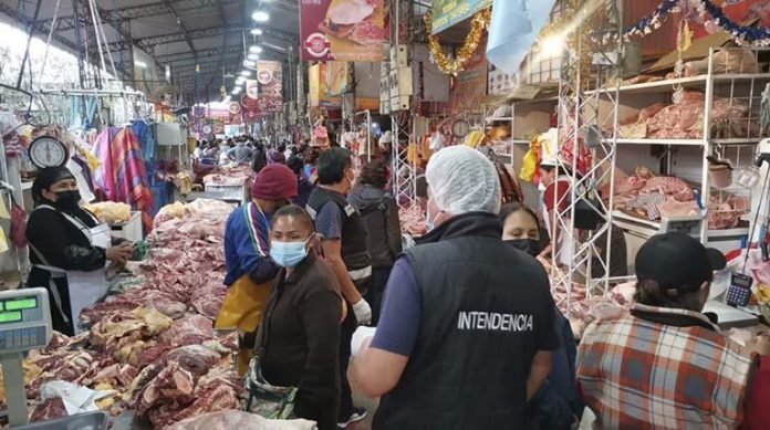 Funcionarios de la Intendencia Municipal de la alcaldía de Cochabamba iniciaron controles en puntos de venta de carne de cerdo en el mercado La Pampa, verificando precios, peso exacto, calidad del producto y cumplimiento de las medidas de bioseguridad.
