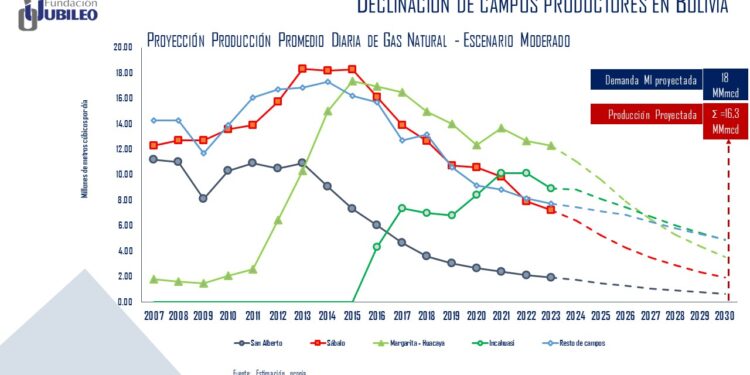 Por ello señala que, en 2014 la producción pasó los 61 MMmcd y en abril de 2023 bordea los 38 MMmcd. A este mes Tarija alcanzó sólo 18,5 MMmcd, Santa Cruz 14,2 MMmcd, Chuquisaca 4,7 MMmcd y Cochabamba a 0,5 MMmcd.