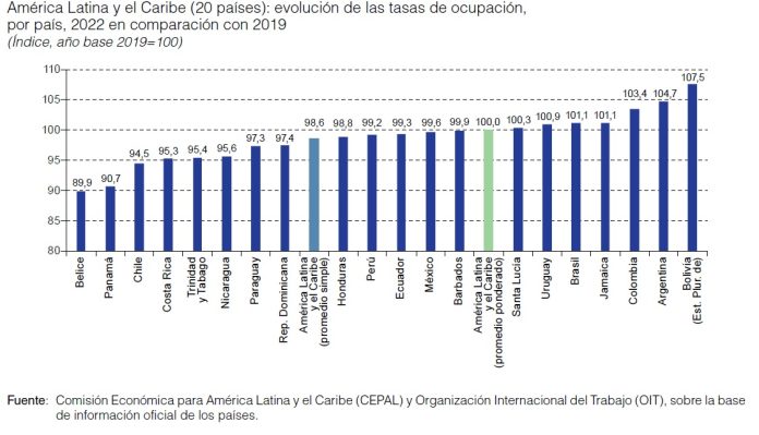 “En efecto, en 2022 siete países habían superado la tasa de ocupación que registraban en 2019, con el Estado Plurinacional de Bolivia y la Argentina en los lugares más destacados, mientras que cinco países estaban a menos de 1,2 puntos porcentuales de recuperar el nivel prepandemia. En cambio, ocho países mostraban rezagos mayores, entre los que se destacaban Belice y Panamá”, apunta el informe.