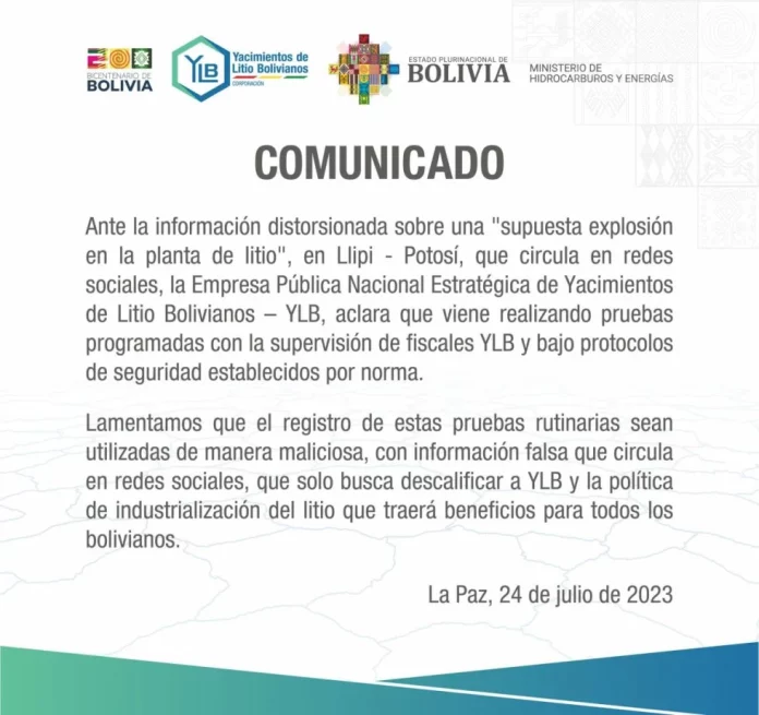 “Ante la información distorsionada sobre una ‘supuesta explosión en la planta de litio’, en Llipi – Potosí, que circula en redes sociales, Yacimientos de Litio Bolivianos aclara que viene realizando pruebas programadas con la supervisión de fiscales YLB y bajo protocolos de seguridad establecidos por norma”, se lee en un comunicado.