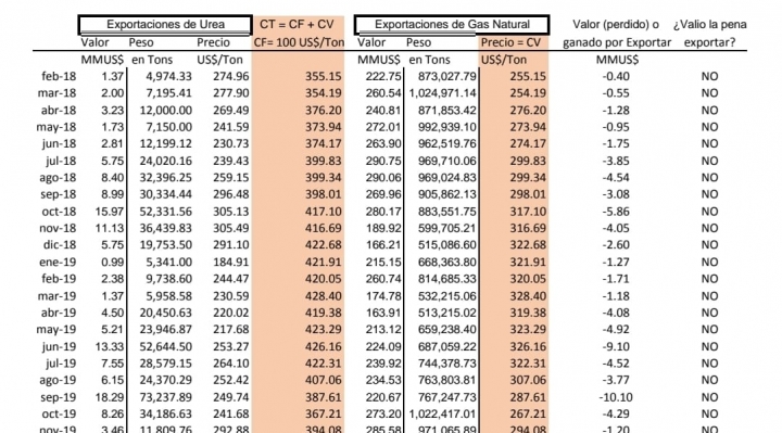 La serie total de pérdidas y ganancias en la exportación de urea, respecto a sólo exportar el gas natural que se usa como principal insumo de producción, muestra que de los 47 meses que existen registros de exportación, sólo en 13 de ellos se superó el costo de exportación del gas natural, los otros 34 meses los costos de producir urea, considerando el costo de oportunidad del gas, fueron mayores a su precio de venta.