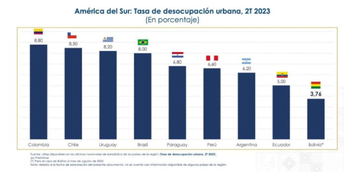 De acuerdo con los datos expuestos por el ministro, al segundo trimestre del presente año, la tasa de desocupación de Colombia es de 8,8%, de Chile de 8,5%, de Uruguay 8,2%, de Brasil 8,0%, de Paraguay de 6,8%, de Perú 6,6%, de Argentina 6,2%, de Ecuador 5,0% y de Bolivia 4%, la más baja de todas.