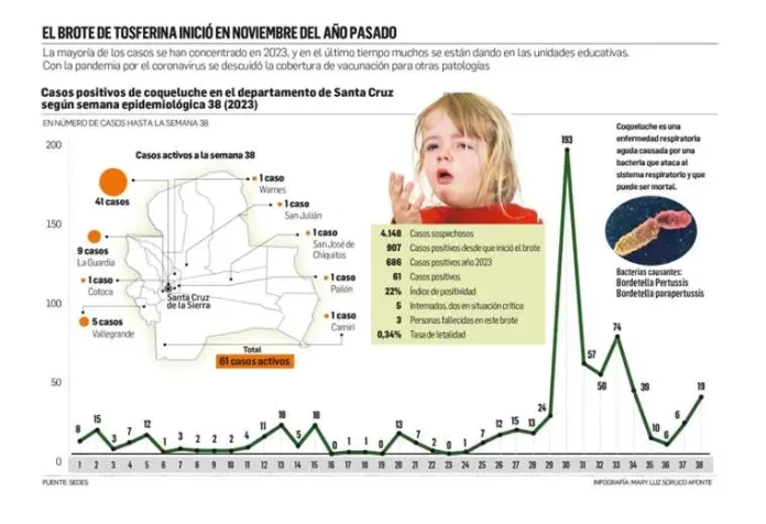 “Finalizada la semana epidemiológica 38, hemos continuado con el repunte de la enfermedad, a pesar de todos los esfuerzos realizados”, inicia el informe del Servicio Departamental de Salud (Sedes) de Santa Cruz, sobre la situación de la coqueluche.