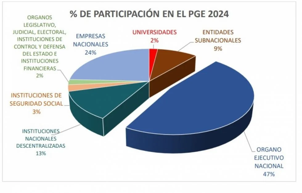 Según el detalle de la AMB, el presupuesto de las universidades se explica porque se destinan Bs 6.658 millones, equivalente al 2%; las entidades subnacionales administran Bs 31.399 millones, equivalente al 9,2%; el órgano ejecutivo nacional Bs 160.640 millones equivalente a 47,2%; las instituciones nacionales descentralizadas Bs 42.124 millones que representa el 12,4%; las instituciones de seguridad social Bs 9.383 millones (2,8%); órganos legislativo, judicial, electoral, instituciones de control y defensa del estado e instituciones financieras Bs 7.764 millones (2,3%) y las empresas nacionales administran Bs 82.350 millones que equivale al 24,2%.
