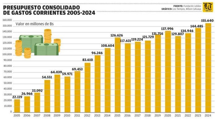 Datos oficiales indican que el presupuesto de ingresos corrientes de 2014 se ubicaba en 124.823 millones de bolivianos, y el de 2024 en 159.981 millones. Los gastos corrientes de 2014 llegaban a 108.604 millones, y los de 2024, a 155.640 millones. Esto no contempla los gastos de capital, que generaron déficits consecutivos desde 2014.