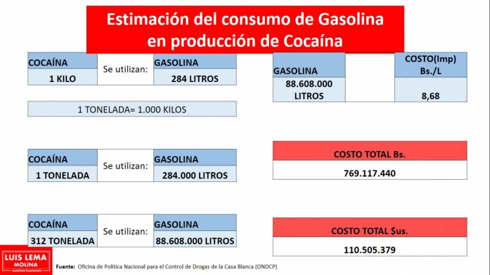 Estas observaciones han sido planteadas por el asambleísta departamental de Tarija, Luis Lema, quien explicó que, según datos de la Oficina de Política Nacional para el Control de Drogas de la Casa Blanca (ONDCP), para producir un kilo de cocaína se requieren 284 litros de gasolina.