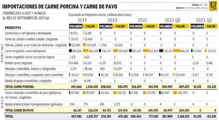 La importación de carne de pavo ha crecido en más del 100 por ciento en los últimos cinco años. Los principales proveedores son Chile, Perú y Brasil. En 2018 se importaron 130.737 kilos de carne de pavo por 426.211 dólares. En cambio, en 2022, se importaron 387.889 kilos por 1,1 millones de dólares.