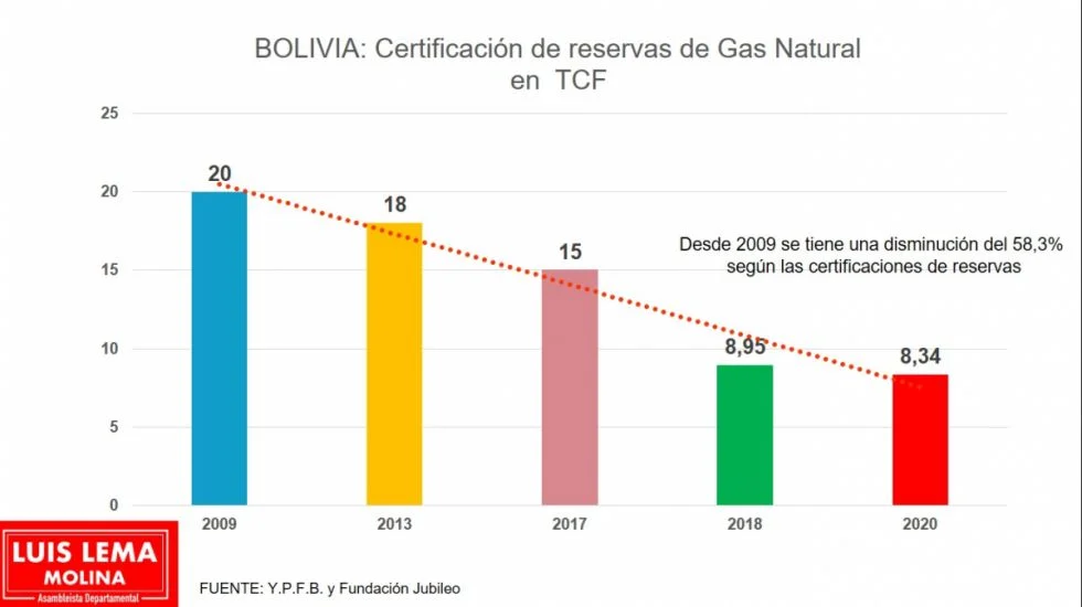 El asambleísta departamental por Unidos, Luis Lema, en un análisis realizado con información obtenida de YPFB y la Fundación Jubileo, advierten que desde 2009 al 2020, las reservas de gas en el país han caído un 58,3%. De tener 20 trillones de pies cúbicos de gas natural (TCF, por sus siglas en inglés) a 8,34 TCF.