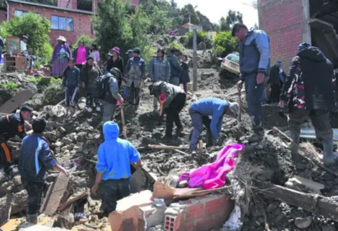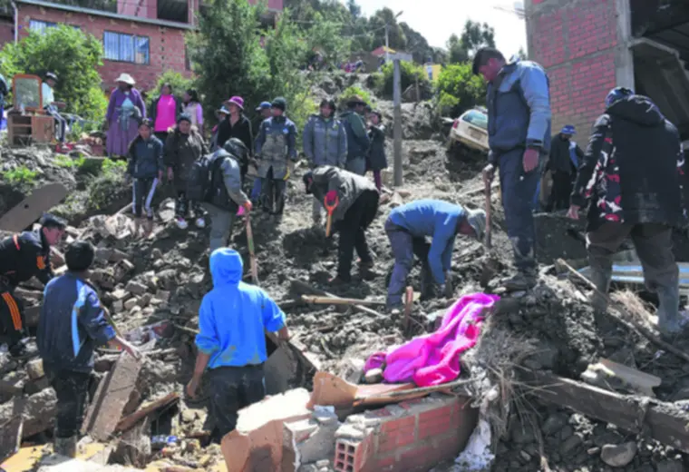 En Achocalla tres miembros de una familia murieron aplastados luego del deslizamiento registrado en la urbanización Arco Iris. Una mujer de 35 años y sus dos hijos, un varoncito de siete años y una niña de un año, desafortunadamente murieron aplastados.