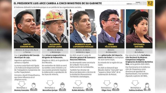 De manera sorpresiva, ayer el presidente Luis Arce realizó cambios en su gabinete de ministros para incorporar a representantes de organizaciones sociales y asegurar su apoyo para contrarrestar acciones de desestabilización promovidas desde el ala evista, particularmente, y otros sectores, sostienen analistas. Pero los radicales del MAS y la oposición aseguran que es un pago de favores y no hay ajustes estructurales, además que se mantiene a los observados.