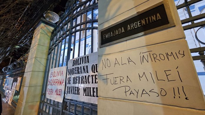 Sectores sociales realizaron este lunes un mitin de protesta contra la Embajada de Argentina, luego que el presidente ultraderechista Javier Milei manifestara que el Gobierno de Luis Arce hizo una “falsa denuncia de golpe de Estado”, al referirse a la toma de la plaza Murillo por un grupo de militares del Ejército el miércoles 26, liderados por el general Juan José Zúñiga.