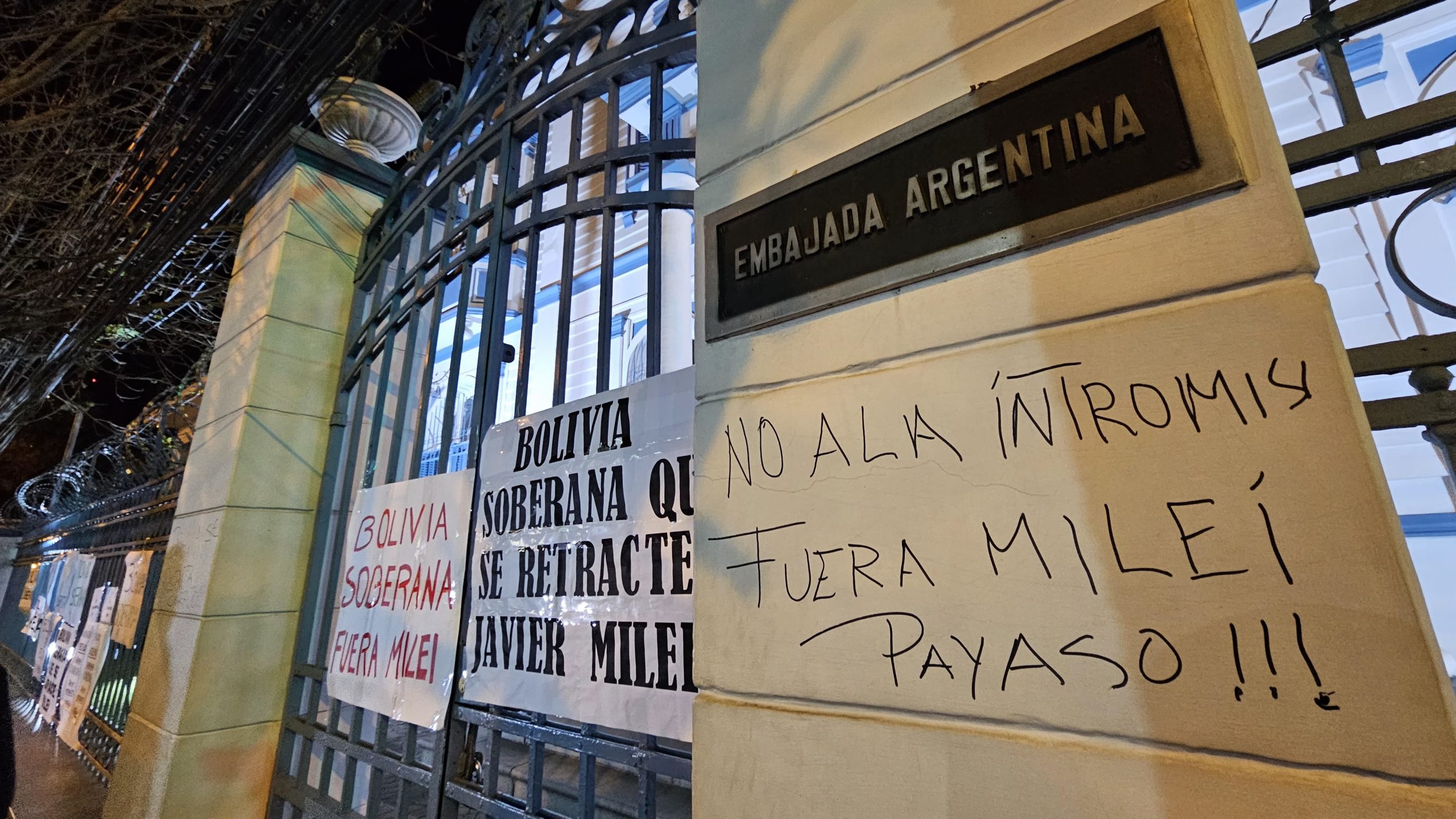Con el grito de “fuera Milei, Bolivia no te quiere” y “Bolivia se respeta” protestaban algunas personas que se apostaron en las puertas de la Embajada de Argentina. A ello, la protesta fue acompañada con carteles que señalaban “Bolivia soberana, que se retracte Milei” y “No a la intromisión”.