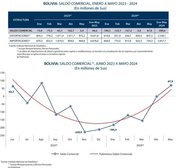 Mientras el saldo comercial deficitario entre enero a mayo de 2023 alcanzó 44,2 millones de dólares, en similar período de la presente gestión la cifra se incrementó a 399,6 millones, que representa un crecimiento de más de 800%, de acuerdo a datos oficiales del Instituto Nacional de Estadística (INE).