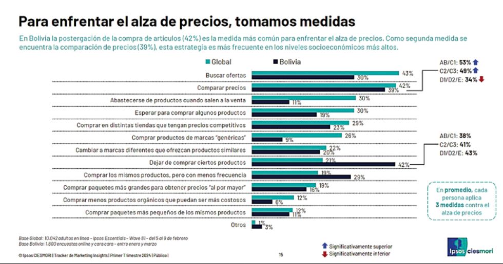 El estudio “Navegando el nuevo contexto económico” pregunta qué medidas toma la gente para enfrentar el alza de precios. A nivel global –fueron medidos 29 países–, buscar ofertas fue la opción más elegida, por un 43 por ciento, pero en el caso de Bolivia, el 42% dejó de comprar ciertos productos; en el indicador global, solo un 21% confesó haber tomado esa decisión ante el aumento de precios.