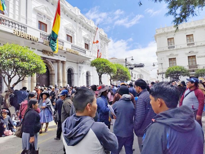 Al promediar las 9:00, una masiva marcha descendió desde la zona de El Reloj por la calle Aniceto Arce hasta el frontis del edificio del Concejo Municipal de Sucre, donde hubo forcejeos con una docena de efectivos policiales que impidieron que los comunarios ingresaran al edificio donde se encontraban algunos ediles.