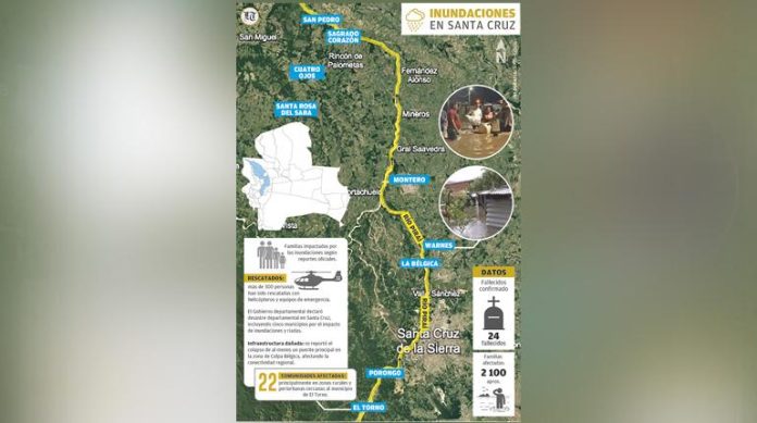 Las lluvias de los últimos meses en Bolivia desencadenaron riadas que arrasaron con comunidades enteras en al menos 25 municipios de Santa Cruz y del norte paceño, dejando un saldo provisional de más de 20 muertos y numerosos desaparecidos. Tipuani, Samaipata, El Torno, Colpa Bélgica, Warnes y otras zonas se vieron gravemente afectadas, mientras los daños materiales aún son incalculables (Vea la infografía).