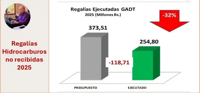 Las regalías por hidrocarburos del gobierno departamental de Tarija por el mes de diciembre de 2025 llegaron solamente a 17,7 millones de bolivianos, de acuerdo a lo presupuestado a comienzos de año, se esperaba 31 millones.