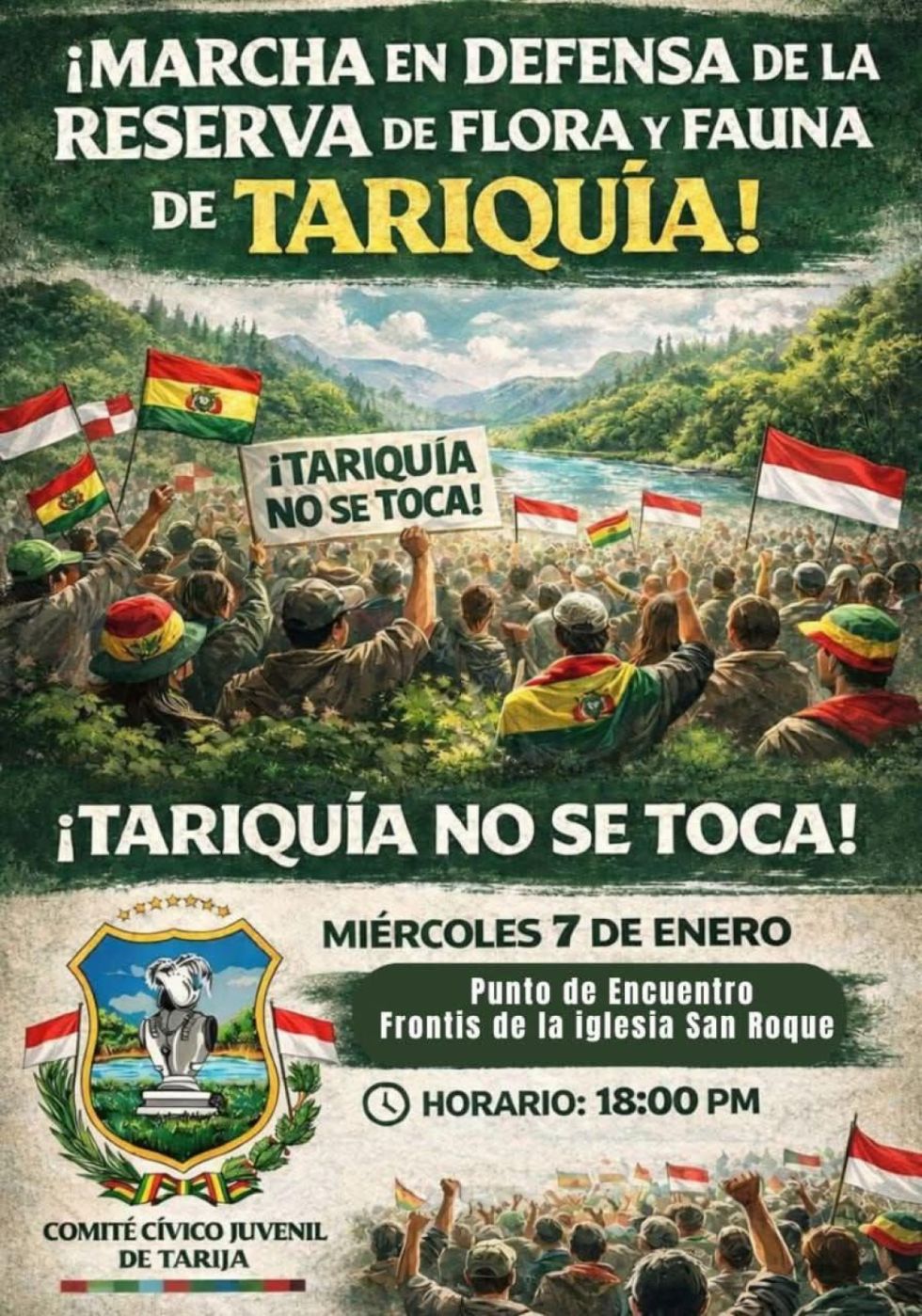 Organizaciones sociales, cívicas y defensores del medioambiente convocan a una marcha por la defensa de la Reserva Nacional de Flora y Fauna Tariquía, que se realizará este miércoles 7 de enero, a partir de las 18:00 horas, en el frontis de la Iglesia San Roque.