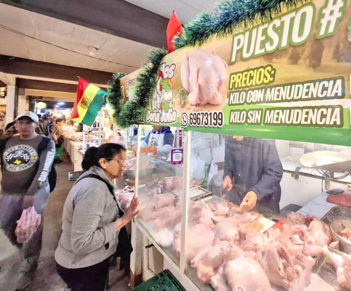 En el Mercado Campesino, administrado por la Federación Única de Trabajadores de Pueblos Originarios de Chuquisaca (Futpoch), el kilo de pollo se comercializaba este jueves en Bs 18 (con menudencia) y Bs 20 (sin menudencia).