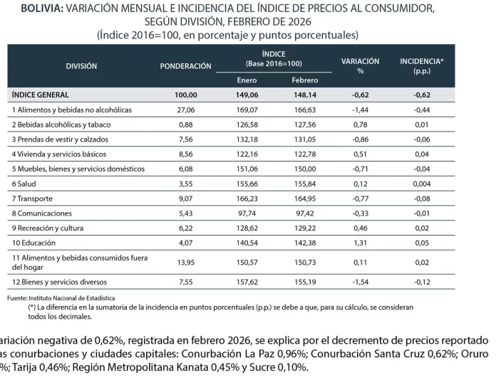 “Bolivia estuvo en estanflación (recesión e inflación) durante 2024 y 2025. Ahora, con inflación negativa (deflación), ya solo estamos en recesión. 19 años de ‘masismo’ nos van a costar un par de años para estabilizar”, escribió el ingeniero Andrés Pucci en su cuenta @andrespucci, luego de conocer el dato del IPC de febrero, que registró una cifra negativa de -0,62%.